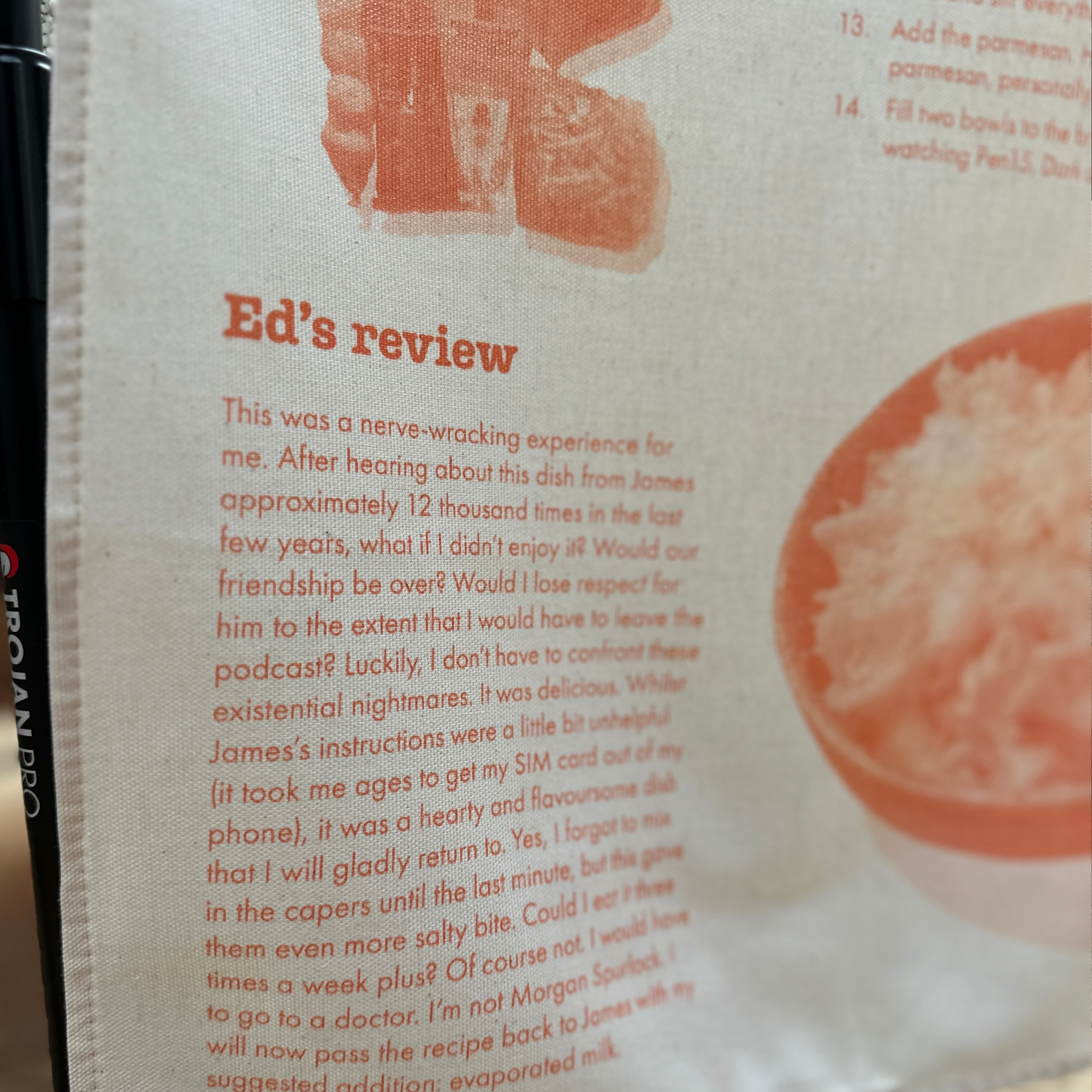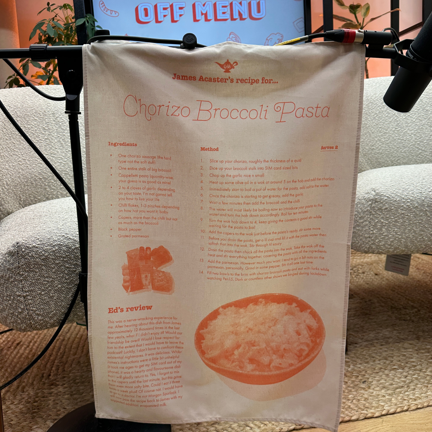 Want to cook James’s favourite dish? Now you’ll always have the instructions to hand with this Off Menu tea towel featuring James’s recipe for Chorizo Broccoli Pasta.