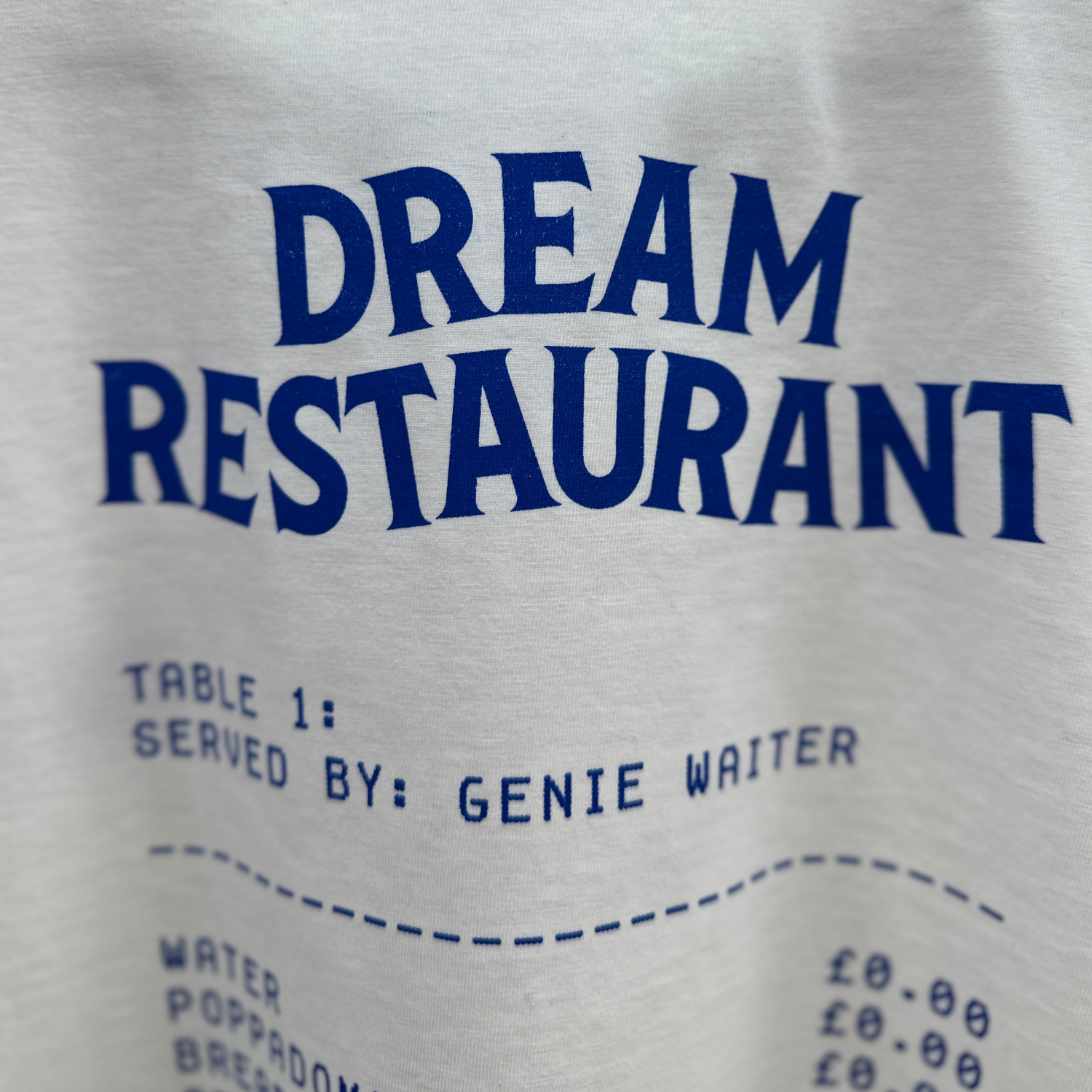 Do you want to commemorate your visit to the Dream Restaurant? This stylish Off Menu t-shirt features a subtle genie lamp design on the front, and on the back a receipt detailing your courses for your Dream Meal.